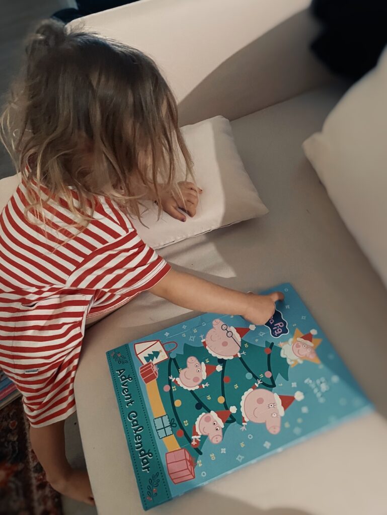 Kuopuksemme valitsi itselleen joulukalenteriksi Pipsa Possun perinteisen suklaakalenterin. Tämä taitaa olla perhehistoriamme ensimmäinen suklaakalenteri.