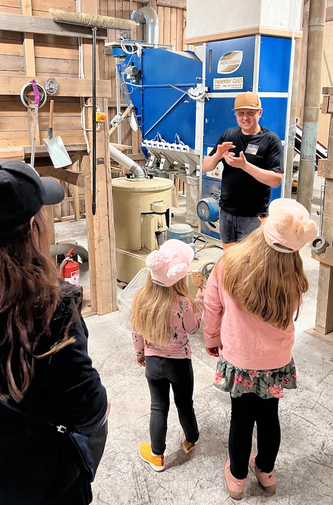 Vanhan navetan ylisille restauroidun näyttävän kahvilatilan lisäksi pääsimme pienelle kierrokselle tutustumaan Krannin tilan kauramyllyyn. Näimme, miten kaurahiutaleita valmistetaan, kun tilan isäntä Olli esitteli meille hieman myllyä ja kertoi tuotannon eri vaiheista.